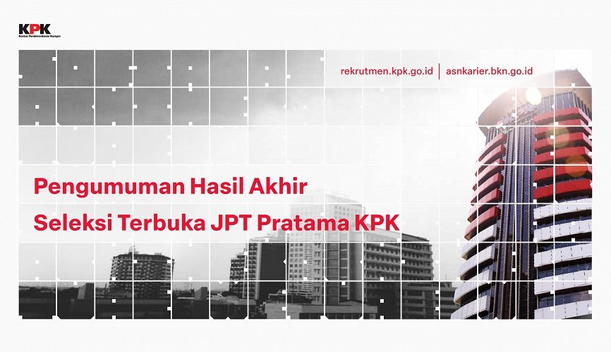 Sehubungan dengan telah selesainya seluruh rangkaian seleksi terbuka calon Pejabat Pimpinan Tinggi Pratama , kami ucapkan terima kasih atas partisipasi masyarakat yang telah menyampaikan masukan, aspirasi dan rekam jejak terkait para kandidat pengisian Jabatan Pimpinan Tinggi (JPT) Pratama di lingkungan Komisi Pemberantasan Korupsi (KPK). Mempertimbangkan hasil dari seluruh tahapan Seleksi Terbuka JPT Pratama di lingkungan KPK, dengan ini ditetapkan 3 (tiga) kandidat terbaik untuk setiap jabatan